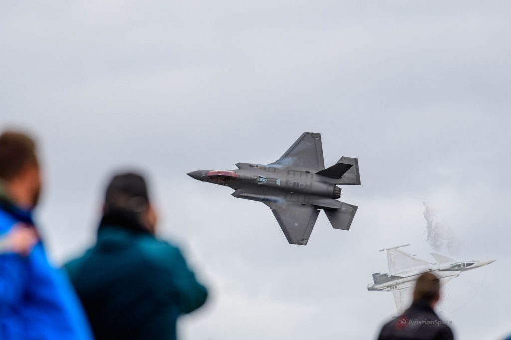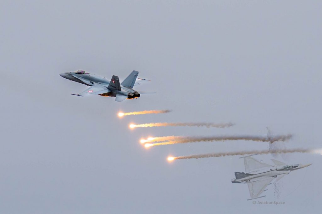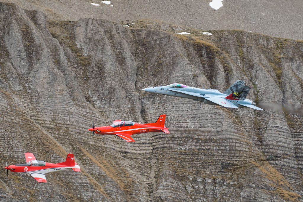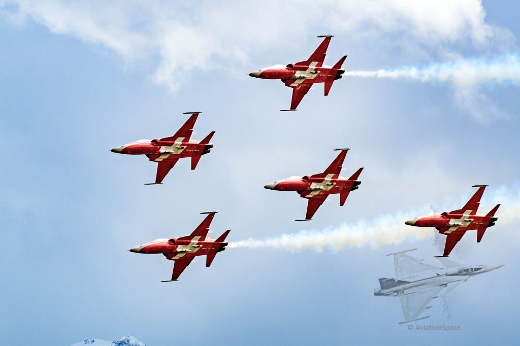 Ein weiteres Highlight war der Vorbeiflug einer Formation aus F-18 der Schweizer Luftwaffe und einer F-35 der Italienischen Luftwaffe. Die F-35 sollen ab 2027 in die Luftstreitkräfte der Schweiz integriert werden und die bisherigen Jets ablösen.
