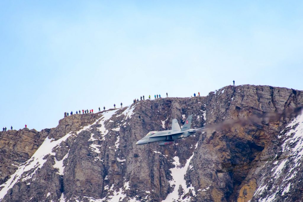 Nach Fondue und Entspannung begann das Fliegerschießen. Die F-18 Hornet der Schweizer Luftwaffe mussten dabei zwei Ziele auf der Ebenfluh anfliegen und treffen. Eine Besonderheit für die Zuschauer ist sicher, dass man die Flugzeuge auf Augenhöhe an sich vorbeifliegen sieht. Das bekommt man sonst nirgends geboten.
