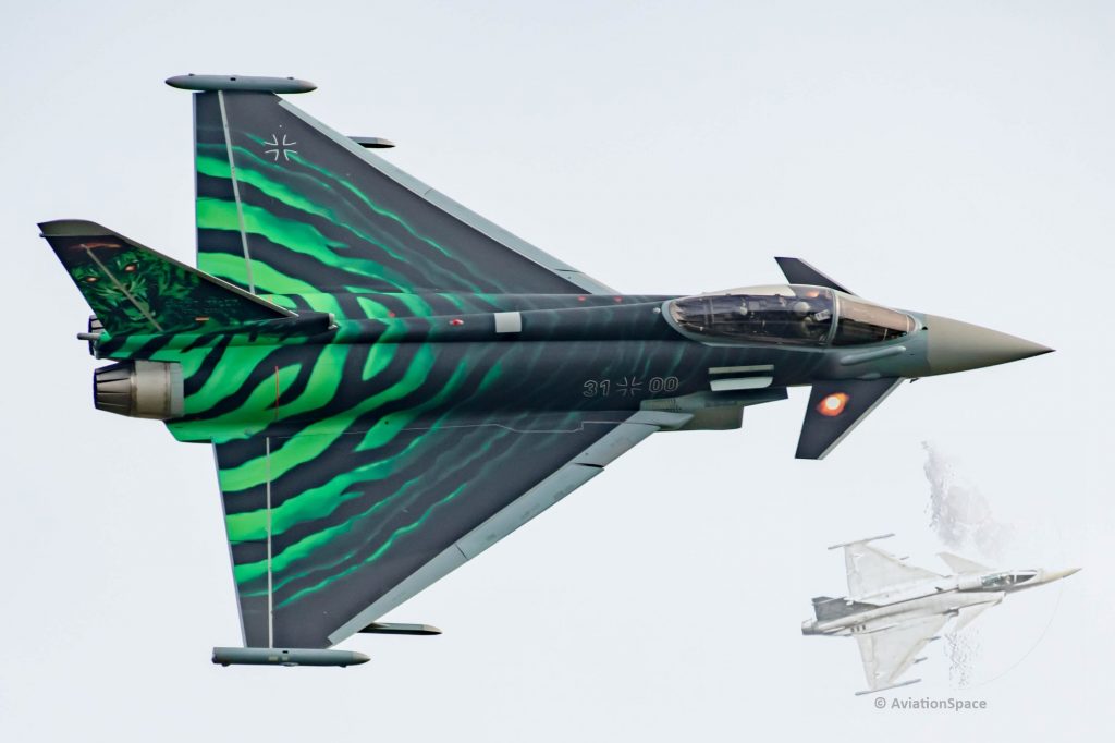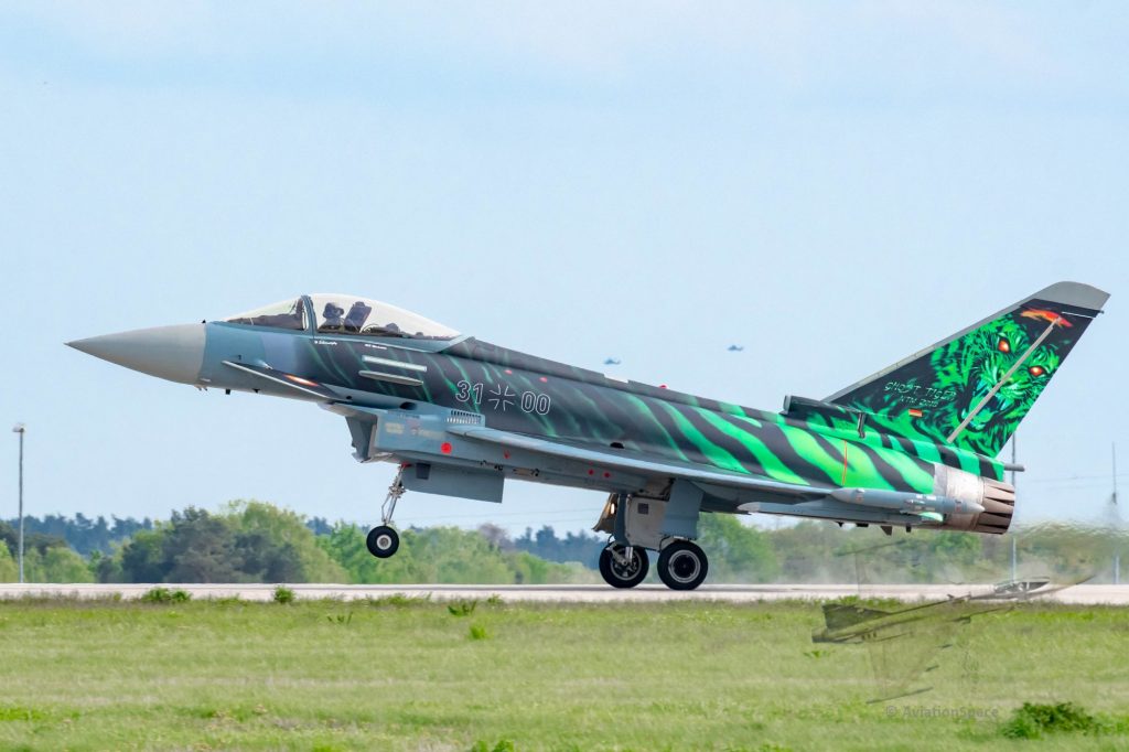 Sehr schön und außergewöhnlich war der Eurofighter Ghost Tiger des Luftwaffengeschwaders Neuenburg in einer Spezialfolierung anläßlich der diesjährigen NATO Übung Tiger Meet.