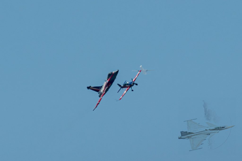 Die Rafale zeigte zunächst ihr beeindruckendes Beschleunigungsvermögen. Per Scramble-Alarm rollte sie in kürzester Zeit zur Startbahn und befand sich wenige Sekunden später bereits im Steigflug um in kürzester Zeit zur Extra 330 aufzuschließen.