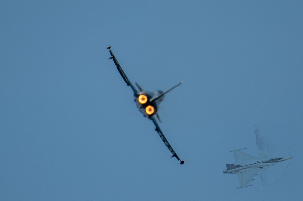 Der Eurofighter startete das Vorführprogramm mit einem kraftvollen Steigflug direkt nach dem Abheben. Bereits in den ersten Sekunden wurde deutlich, wie viel Schub und Agilität in den beiden EJ200-Triebwerken steckt. Nach dem Take-off folgten enge Kurven, schnelle Rollen und steile Steigwinkel – alles in niedriger Höhe und dicht vor dem Publikum.